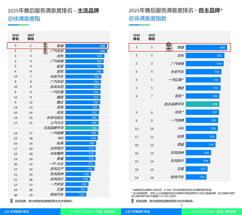 9月19日,J.D. Power正式发布了《2025中国售后服务满意度指数研究(CSI)》报告。奇瑞汽车凭借出色的服务品质和广泛的用户认可,不仅荣获主流品牌售后服务满意度排名第一,也摘得自主品牌冠军,成为名副其实的“双冠王”。在此之前,奇瑞接连斩获J.D. Power中国销售服务满意度(SSI)、中国汽车产品魅力指数(APEAL)、中国新车质量研究(IQS)三项自主品牌第一,成为历史上唯一荣获J.D. Power年度四项自主第一的品牌。
