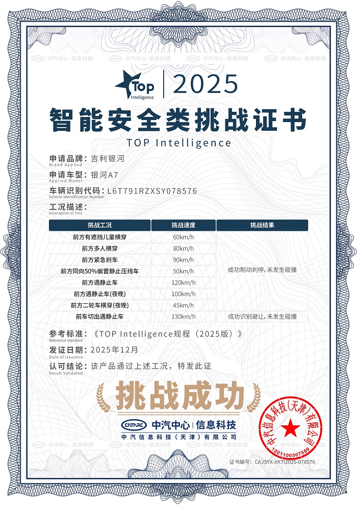 12月25日,吉利银河A7成功通过中汽中心行业首次中型插混轿车「双TOP」顶级安全挑战,成为行业唯一同时获颁安全性能类挑战证书和智能安全类挑战证书的的车型。安全家轿认准银河A7!凭借吉利汽车全域安全体系的最坚实底座,吉利银河成为了全球最快达成年销百万辆的新能源汽车品牌,作为银河品牌主打车型之一,吉利银河A7完整继承了吉利的安全基因,凭借7大核心安全实力,成功通过中汽中心安全大考,再次证明其作为十万级混动家轿安全新标杆的颠覆性实力。