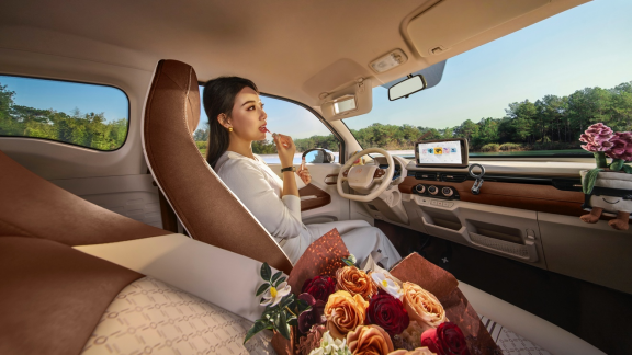 女王版内饰以“琥珀流光”为主题,颜色以温润的暖阳米奠定主基调,局部以复古棕精巧点缀,温暖且富有时光故事感。皮织物混搭座椅、同级唯一的皮质方向盘,触感亲肤;以及刺绣头枕、主驾带补光灯的化妆镜,共同构筑了一个充满仪式感与呵护感的移动空间。