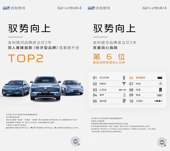 杰兰路报告指出,吉利银河在品牌知名度、用户偏好度、NPS净值等关键指标上均表现亮眼,品牌知名度稳定在90%以上,迅速完成了用户心智的有效占位。这些数据背后,是吉利银河在产品、技术、体系三大维度的全面发力,共同构筑了其快速崛起的核心竞争力。
