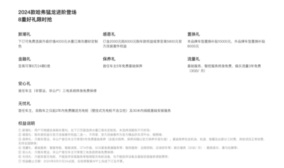 国补+厂补置换补贴高达3万元,实打实的现金优惠是真香。5年免费保养,三电终身质保,让出行更加安心可靠。免费体验水墨江南灰磨砂定制色加装,购车之初就能领略到哈弗猛龙的前卫与时尚,为出行增添一抹亮色。