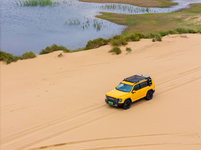 车辆还配备了雪地、沙地、泥地等七种驾驶模式,足够应对各种复杂地形。在阿拉善穿越中,沙地模式发挥了关键作用,全时四驱,前后桥驱动力控制与底盘系统配合,动力随路面变化自动调整,行进更从容不迫。