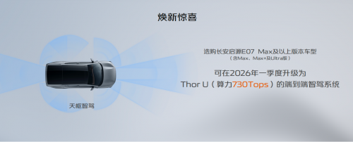 值得一提的是,品牌方还为消费者带来“焕新惊喜”。基于长安汽车全栈自研的SDA天枢架构所具备的“硬件可插拔”能力,长安启源E07 Max及以上版本车型(含Max、Max+及Ultra版),预计将在2026年一季度升级搭载高算力Thor U(算力730Tops)的端到端智驾辅助系统,让用户畅享更智能、更安全的城区智驾体验。